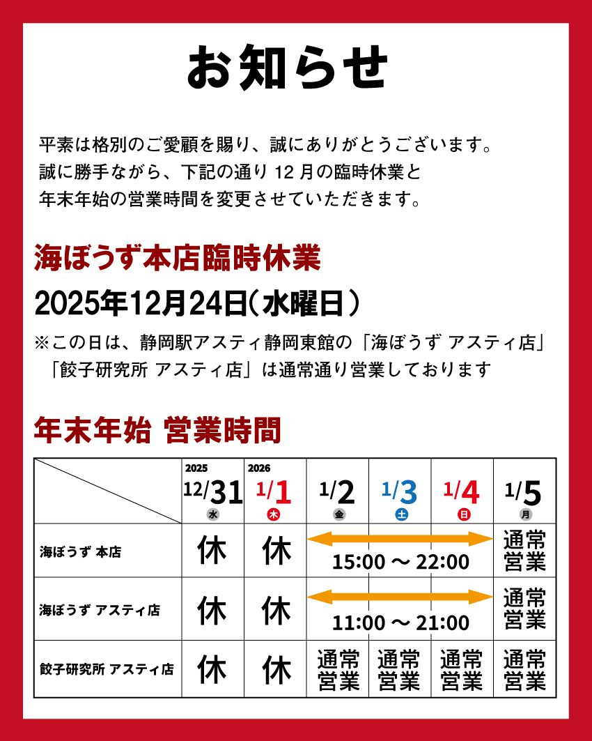 - 海ぼうず本店・海ぼうずアスティ店・餃子研究所 -